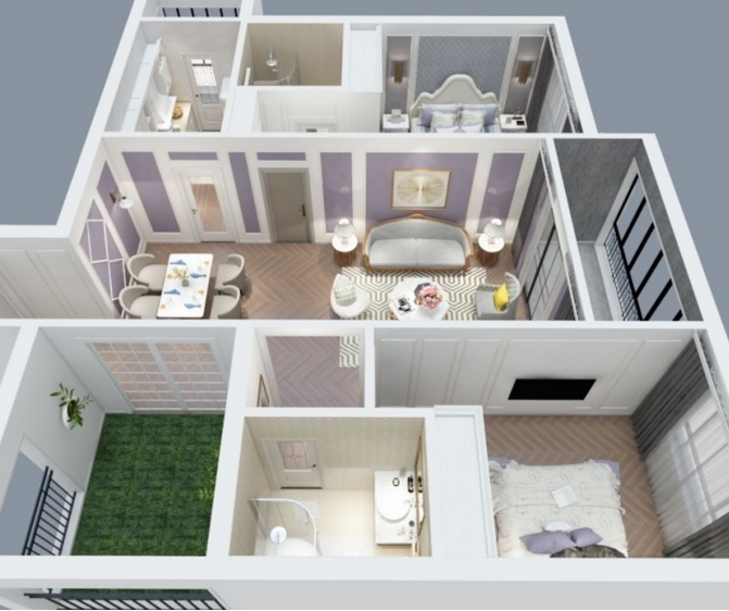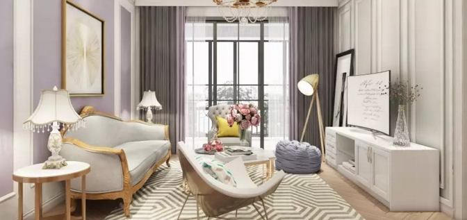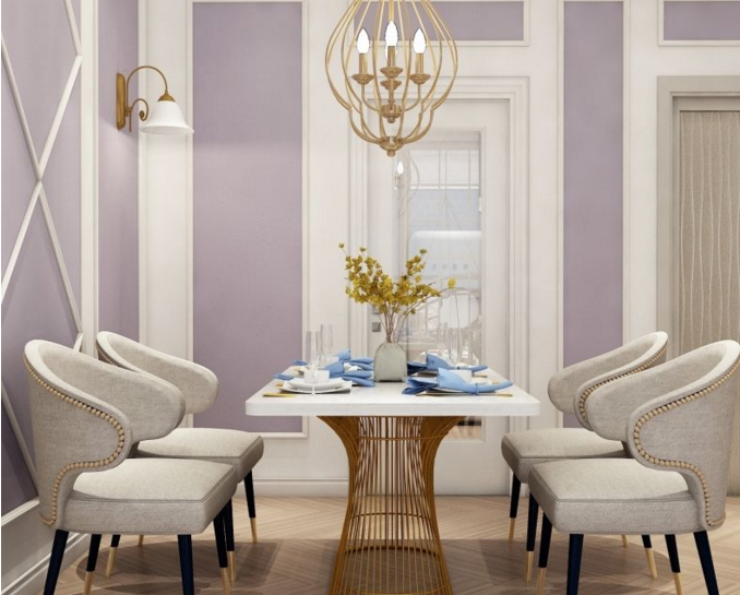客廳淡紫色的墻面搭配白色的墻面造型線條,這一組合溫馨而又浪漫。金屬色彩的搭配使得整體的奢華感提升:餐廳灰色的餐桌椅搭配墻面菱格造型線條,歐式的金屬造型吊燈,在這浪漫的氛圍之下就餐,每天都是一次浪漫的晚餐。