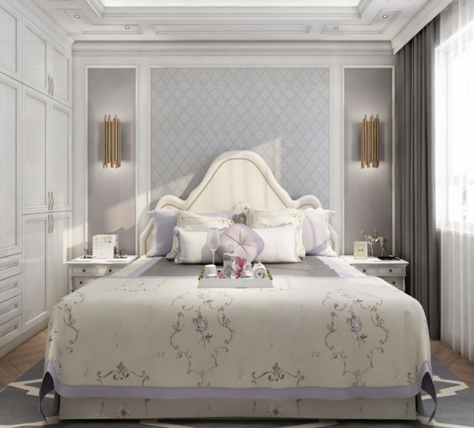 歐式造型的皮質背景墻搭配金屬吊燈,溫馨之中帶著紫色的浪漫。軟裝的搭配以歐式花紋搭配淡紫色布藝抱枕組合,整體色調為淺色調,臥室主要以溫馨舒適為主。