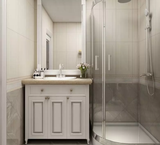 歐式的衛浴柜作為梳洗的區域,整體色調明亮。空間分區明確,干濕分離。墻面造型瓷磚的搭配個性十足,層次分明。