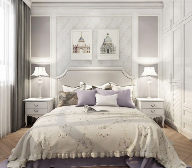 歐式的建筑掛畫搭配淡紫色的軟裝配飾,顯得高貴、優雅。歐式的裝飾線條和門板造型讓整體的氛圍更加和諧。