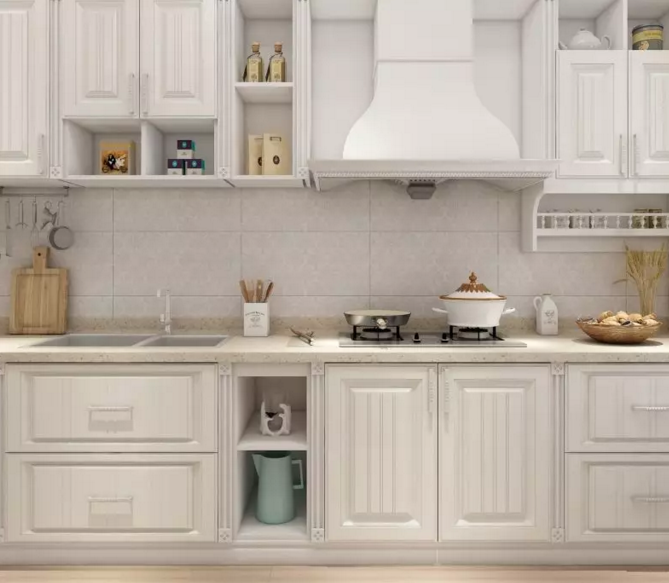 廚房整體為淺色調,顯得更為明亮:歐式造型的門板、裝飾柱、裝飾線條,整體造型精致的同時也擁有強大的廚房儲物功能。