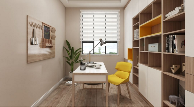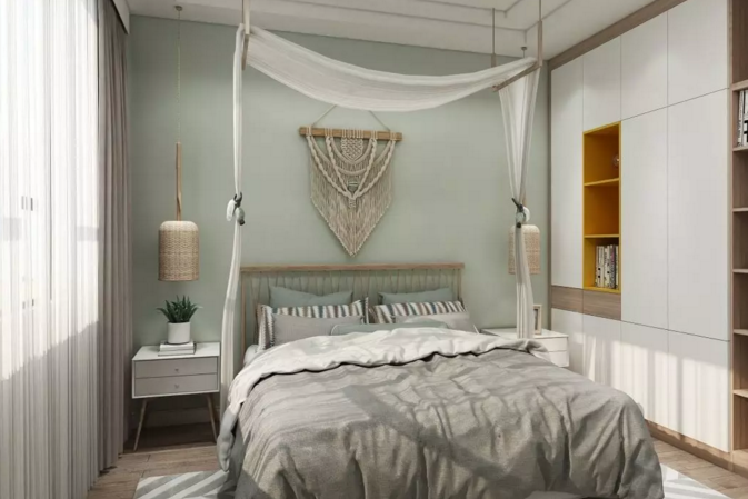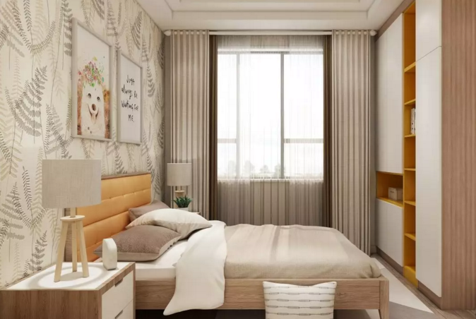 次臥使用了黃色是大自然的顏色,木制床頭柜和木床,又給整個空間增添溫馨。
