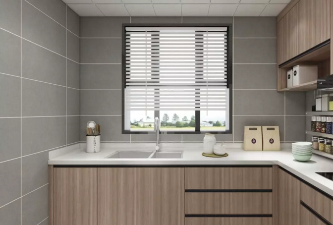 整體廚房仿古磚材質的灰色瓷磚貼墻,清爽整潔,干凈利落,也會給下廚的人一個好的心情。