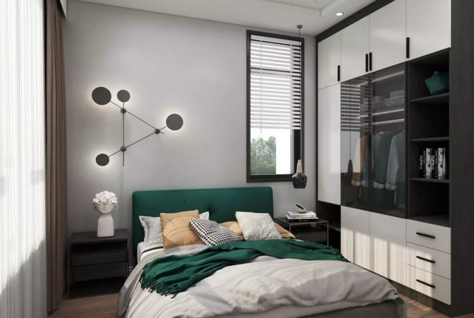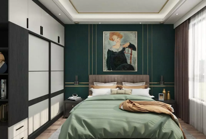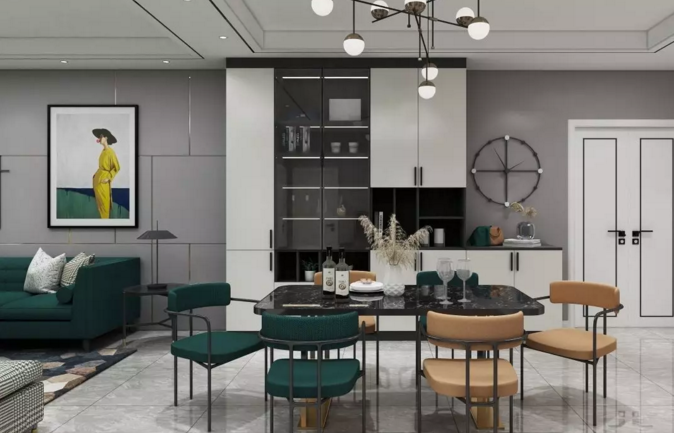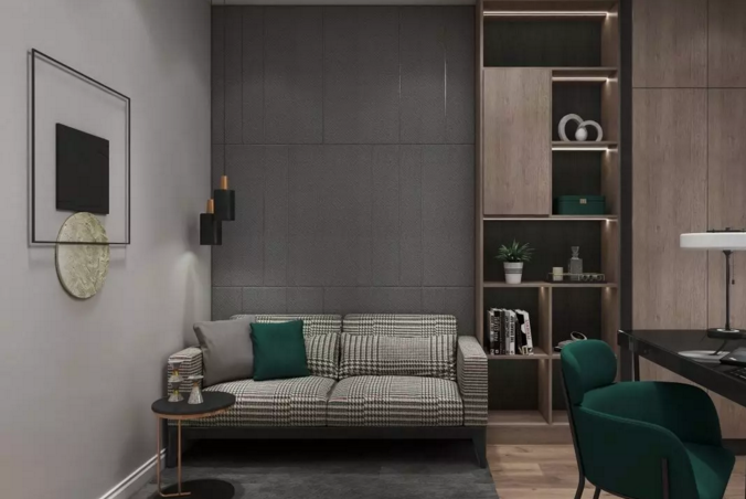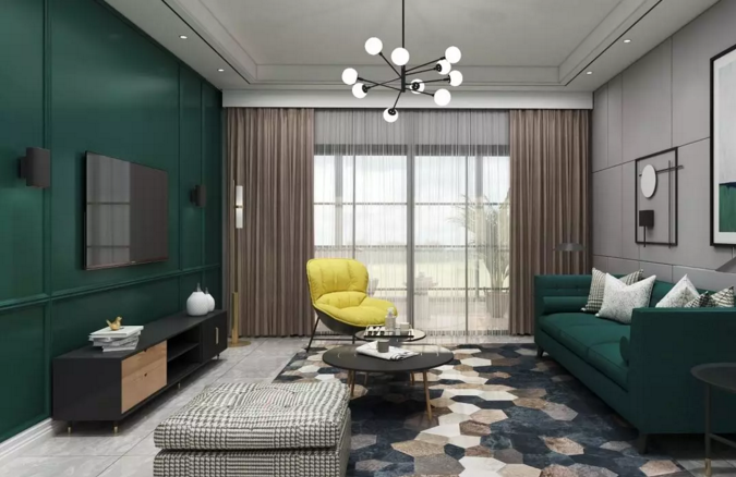 客廳空間整體以素色為肌底,墨綠沙發與背景墻給人視覺沖擊,通過色彩的對比將視覺重心下移,營造出舒適放松的家居氛圍。