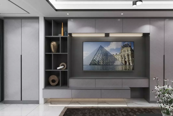 超大收納的電視柜做背景墻,外觀時尚并且極大的增加了收納空間。