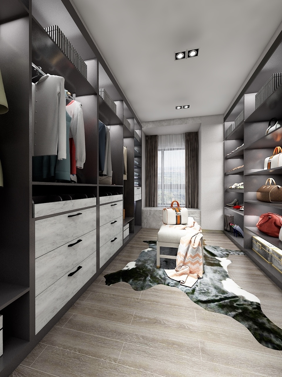 這種L型衣帽間,定制一整排衣柜足夠用,對(duì)于那些沒有太多衣物收納的朋友來說,為了空間不浪費(fèi),一旁定制梳妝臺(tái),既節(jié)省了臥室空間,還能讓女主人化完妝直接更衣,一個(gè)流程全搞定美美噠出門。