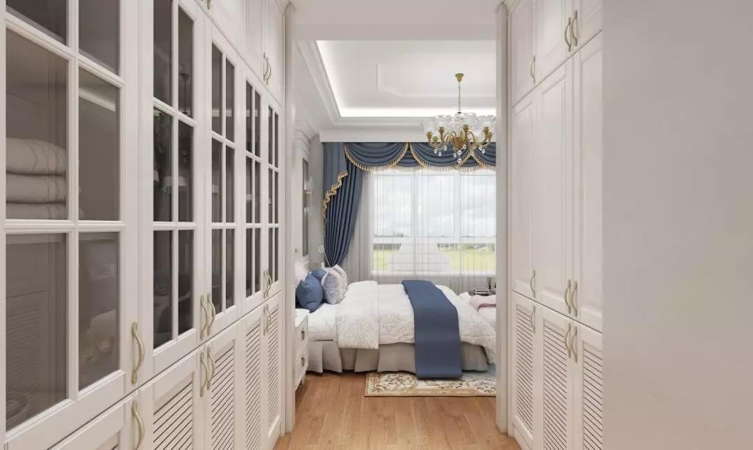 走廊式衣帽間的設計節省空間,搭配玻璃柜門增添時尚,添加了歐式的經典元素,盡顯浪漫典雅,非常適合長條型臥室。