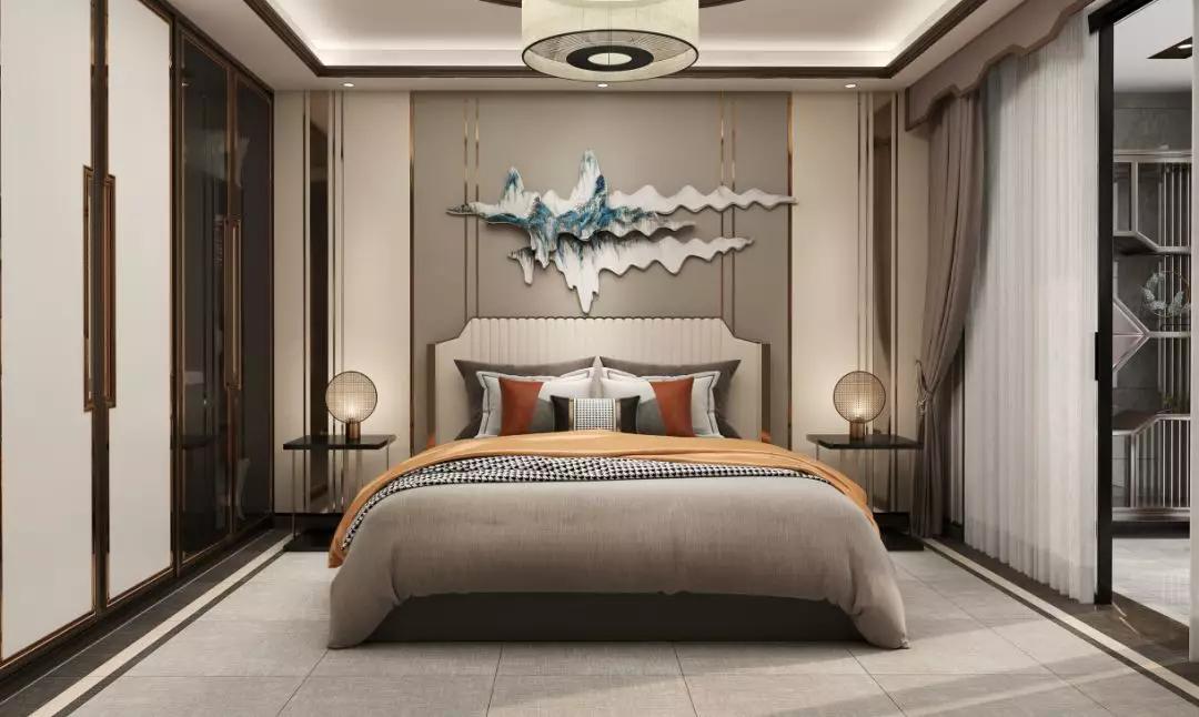 臥室空間按照戶型不同,不僅可以增加衣帽間的設計,書房或者休閑區都可以與臥室空間相互融合。新中式的臥室設計充滿韻味,衣帽間的加入,完美營造出時尚與古典合二為一的舒適空間。