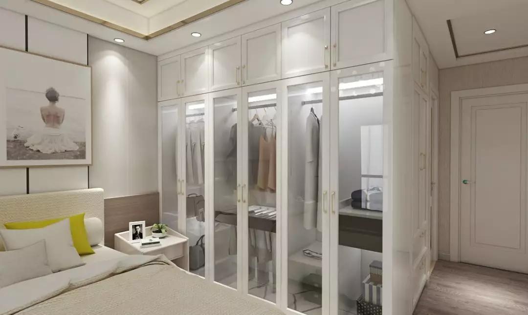到頂衣柜節省空間,玻璃柜門使得空間格外通透,精致拉手彰顯時尚,臥室也可以精致如畫。