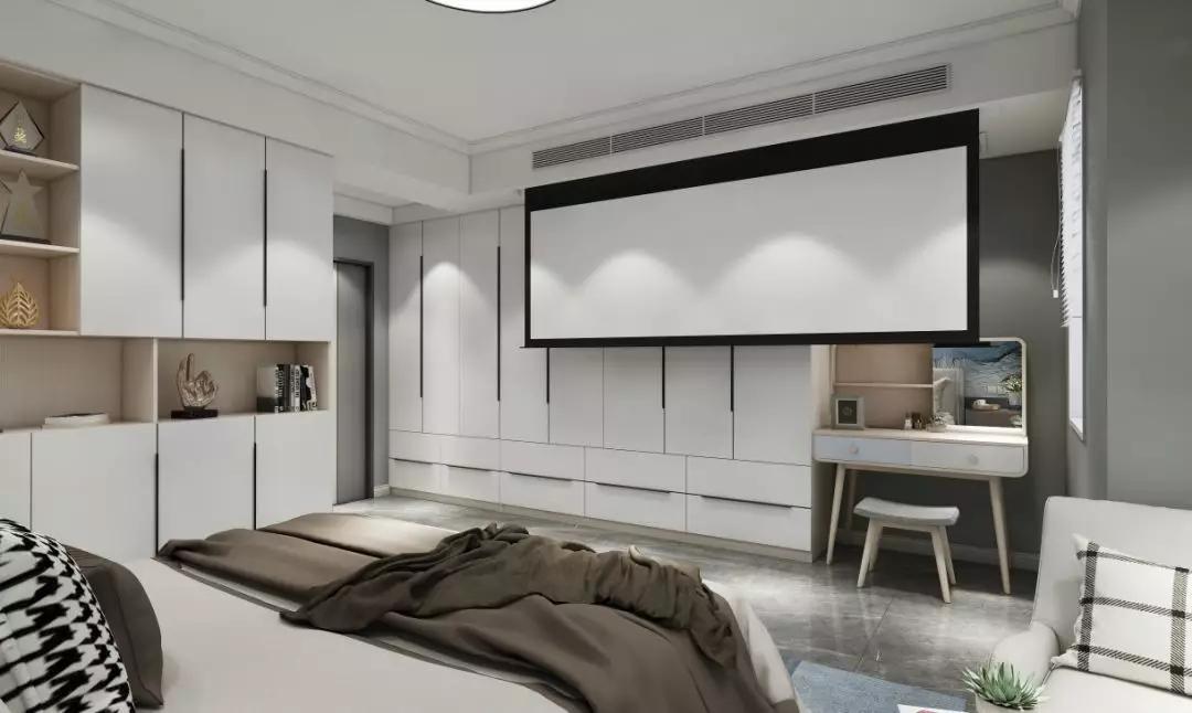 在到頂衣柜加梳妝臺前設計自動升降放映屏,由于疫情在家的小伙伴們,也能享受電影院的大屏觀影。