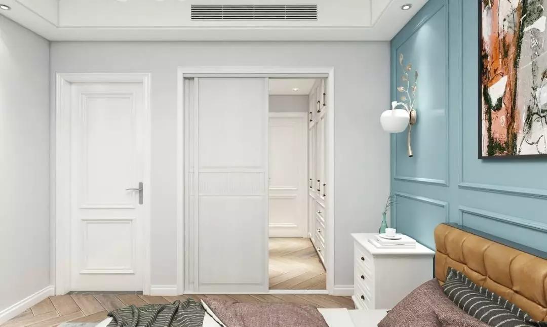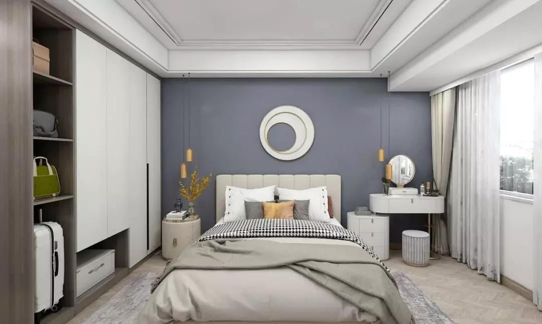 臥室與衣帽間相互融合,一推開衣帽間的門就能感受到浪漫氣息,藍色的背景墻增添時尚之感。