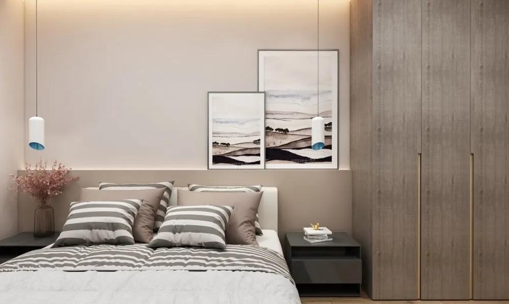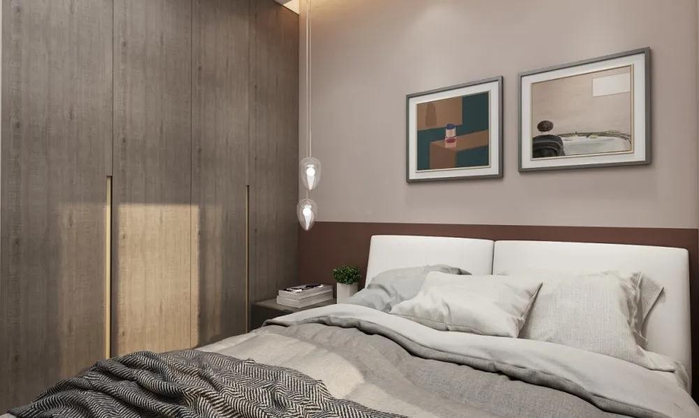 次臥色調與其他空間色調一致,淺駝色的背景墻、原木色的到頂衣柜、時尚吊燈的搭配完美營造出雅致的次臥空間。