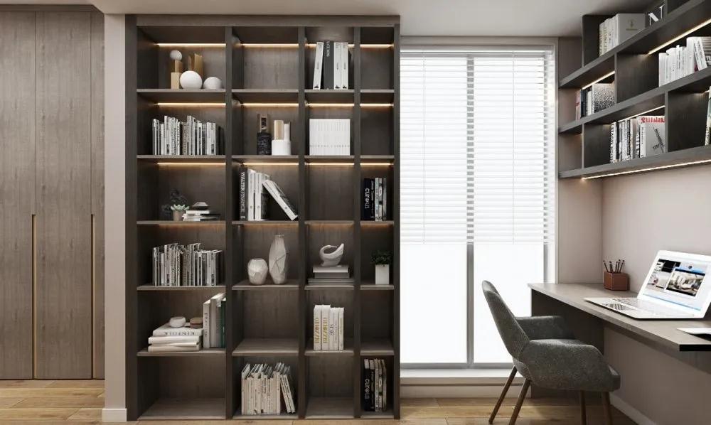 對于工作的忙碌的人來說,在臥室設計簡易小書房作為工作區是非常實用的,書架內部安裝貼心感應燈帶,拿取更方便。