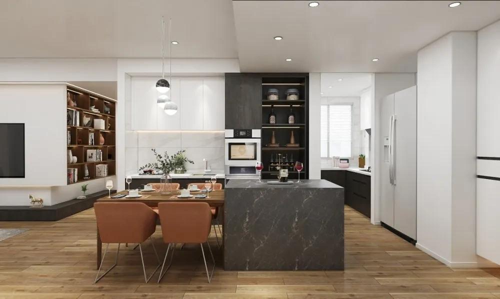 廚房與餐廳設計一體化,既實用又美觀,棕色調的餐椅與灰色大理石臺面質感十足,再配上簡潔的白色以及暖色的燈光既溫馨又充滿格調。