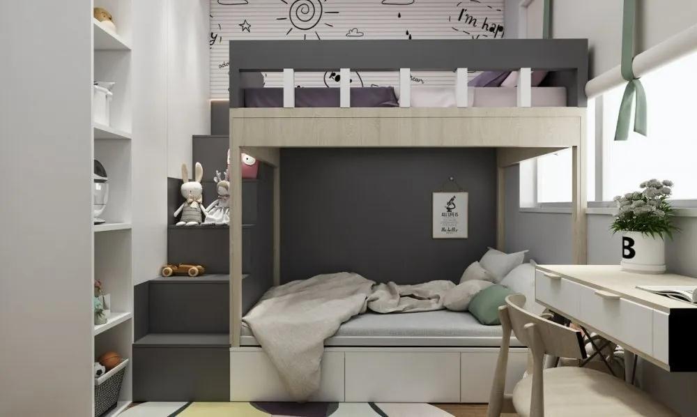 空間小、孩子多設計上下床準沒錯,上鋪有護欄安全有保障,臺階作為收納柜實用性高,原木色搭配灰色質感十足,墻紙增添童趣。