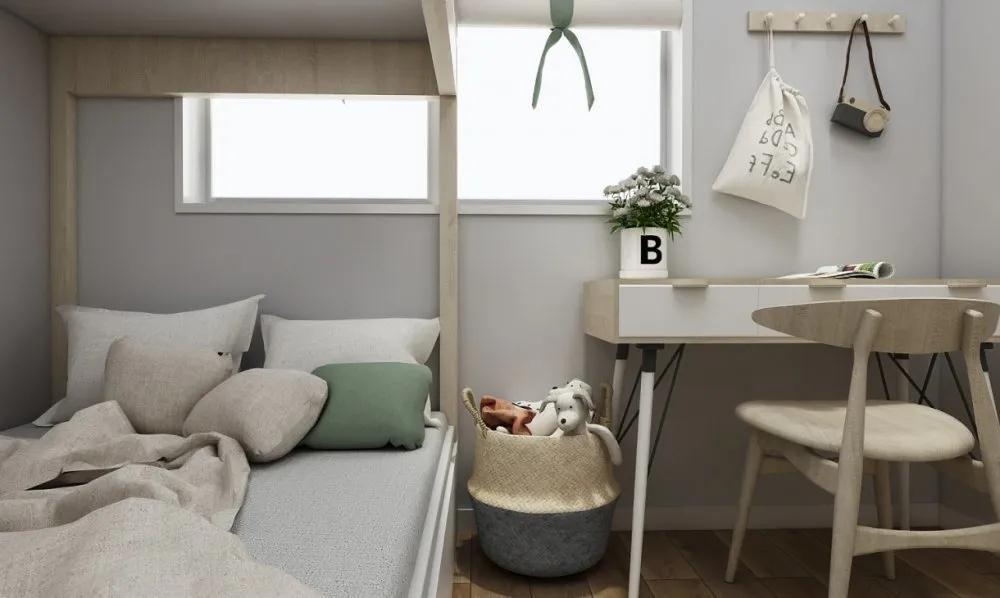 書桌組合是兒童房必不可少,靠近窗戶光線充足,孩子在學習既能提高效率也能更好的保護眼睛。
