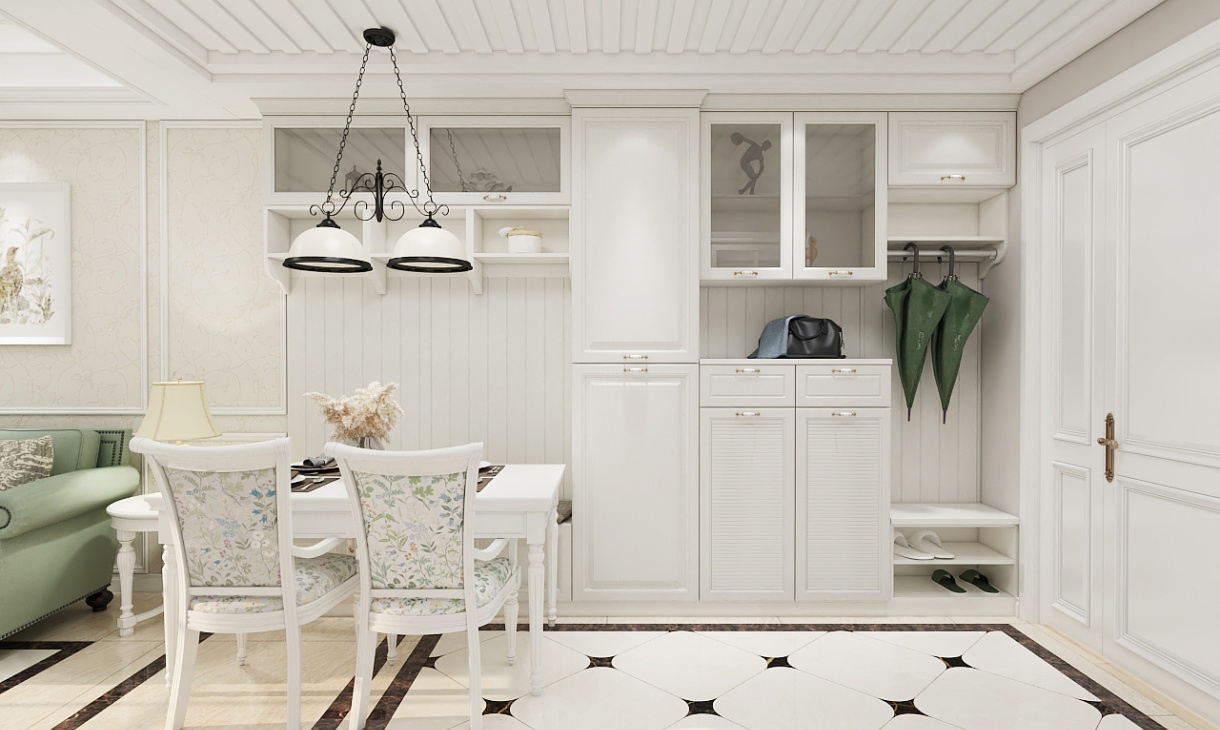 餐廳與入戶玄關處一體化設計,大面積的儲物柜和卡座連成一體,無論是收納還是餐桌位置都一并俱全。大面積柜體設計完美解決了空間的收納問題,預留充足的用餐區,方便家人就餐,一舉兩得便捷生活。