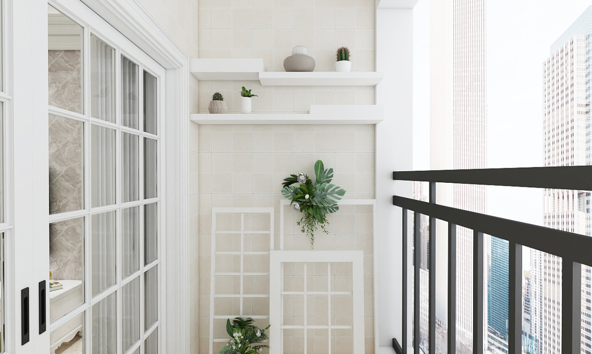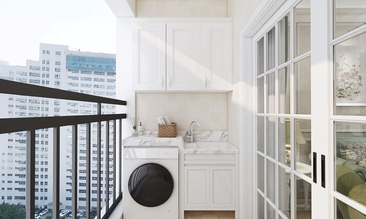 陽臺作為休閑放松的好去處,長廊性陽臺實用功能與美觀都不能少,一邊是洗衣機柜和吊柜設計。