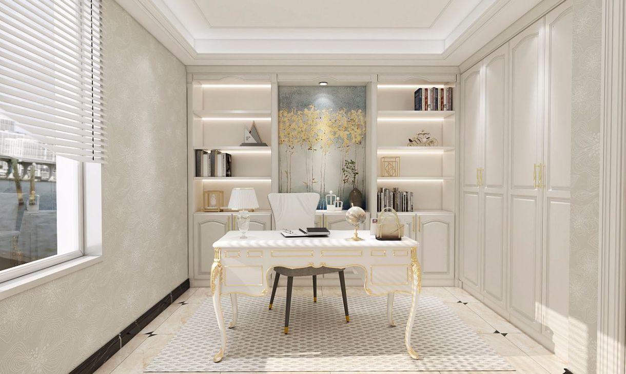 書房充分利用空間定制大面積收納柜。入墻式的柜體設計讓空間,大方得體,干凈悠揚。簡約的書柜設計,層板間加以燈帶點綴,一副水墨畫擺放其中,彰顯高端品味。