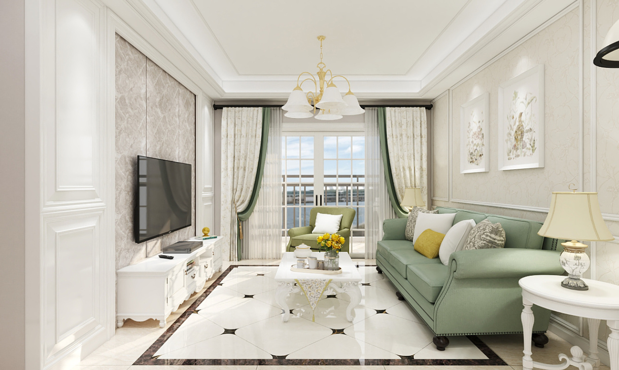 進入客廳,獨特的斜拼磚造型設計映入眼簾,綠色沙發占據C位,搭配大理石背景墻,兩者融合渾然一體,為客廳空間增加光彩。