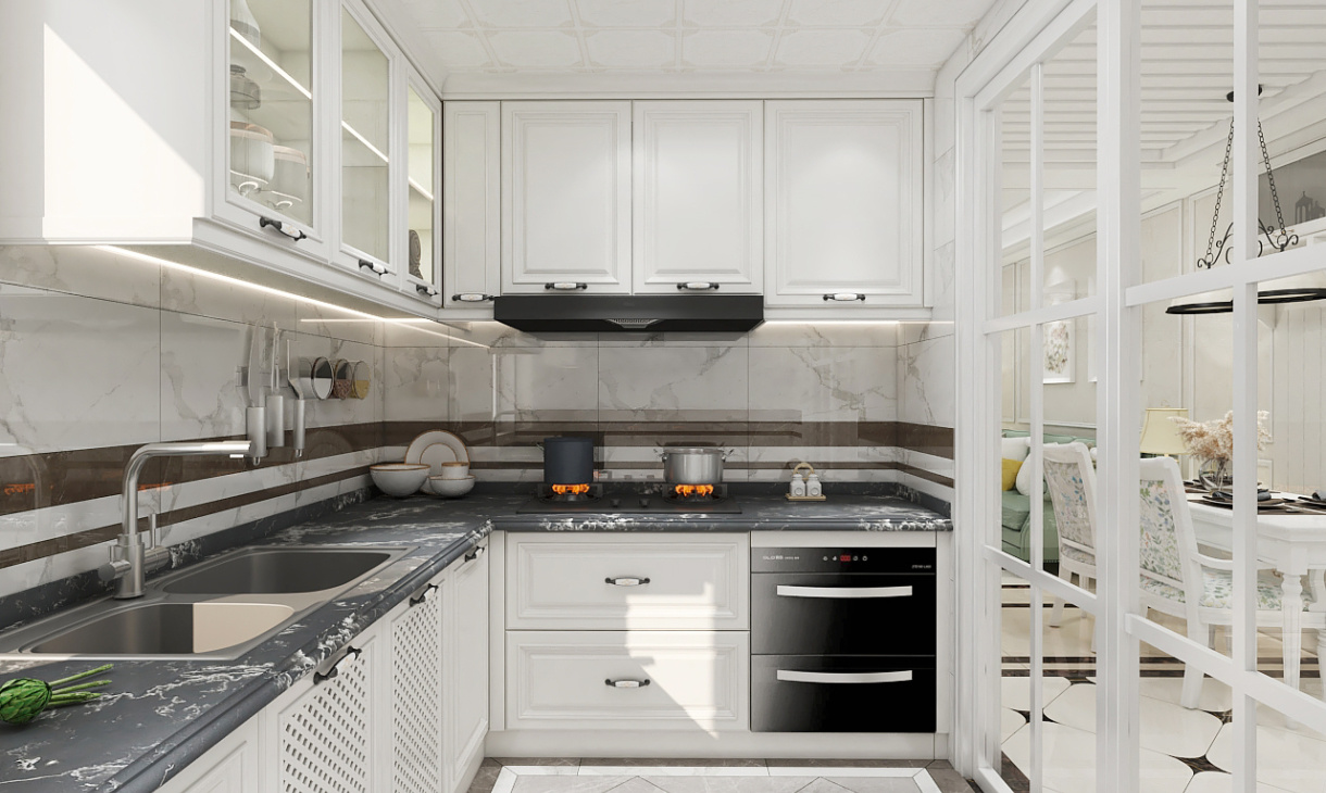 廚房雖小,L型整體櫥柜設計給廚房大大的可利用空間,吊柜玻璃門進行點綴,為廚房增光添彩,背景墻使用大紋路的魚肚白瓷磚,整體搭配渾然天成,讓人眼前一亮。
