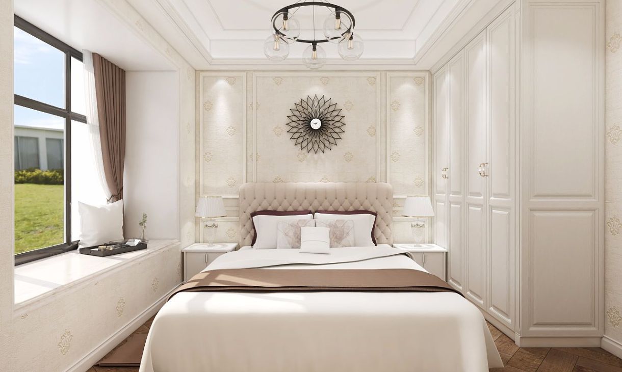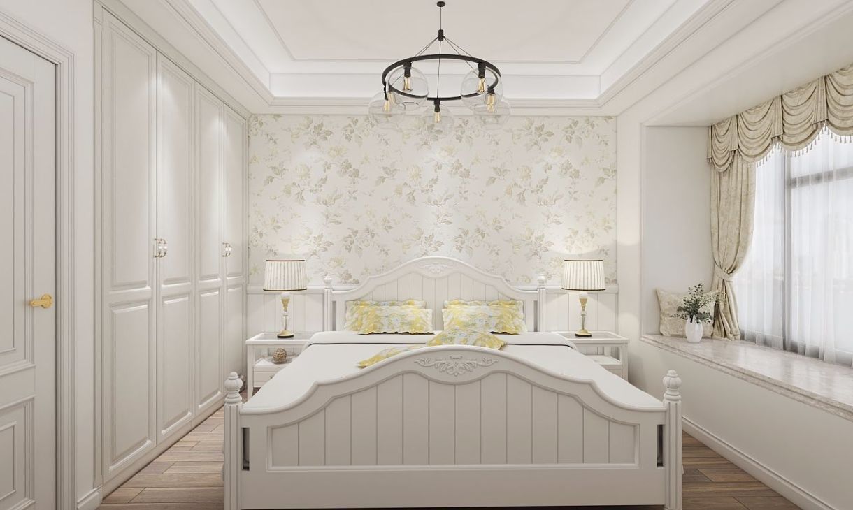 客臥房以白色為基調,淺藍色作為搭配色點綴空間。歐式田園風的衣柜和床呼應整個空間的主題。