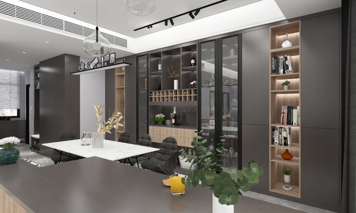多功能餐邊柜是餐廳的亮點,設計大量開放區,放酒水、花瓶、書籍等任意裝飾物,除了用作收納的餐邊柜也可以是展示架,彰顯情調。