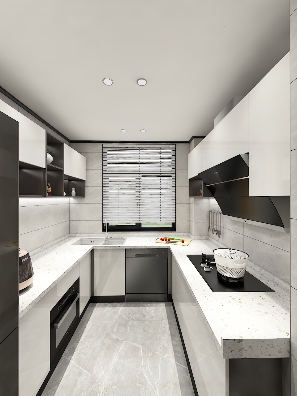 U型廚房同樣延續黑白灰風格,上下櫥柜大大增加儲物空間,水槽、洗碗機、蒸烤箱等一應俱全,方便日常烹飪備餐。