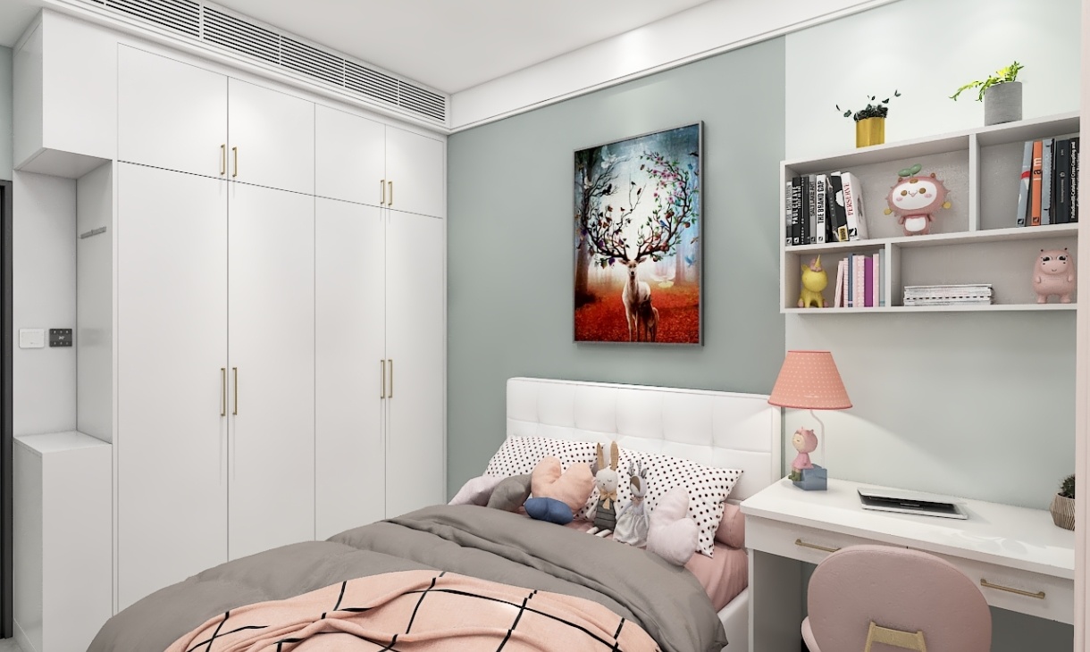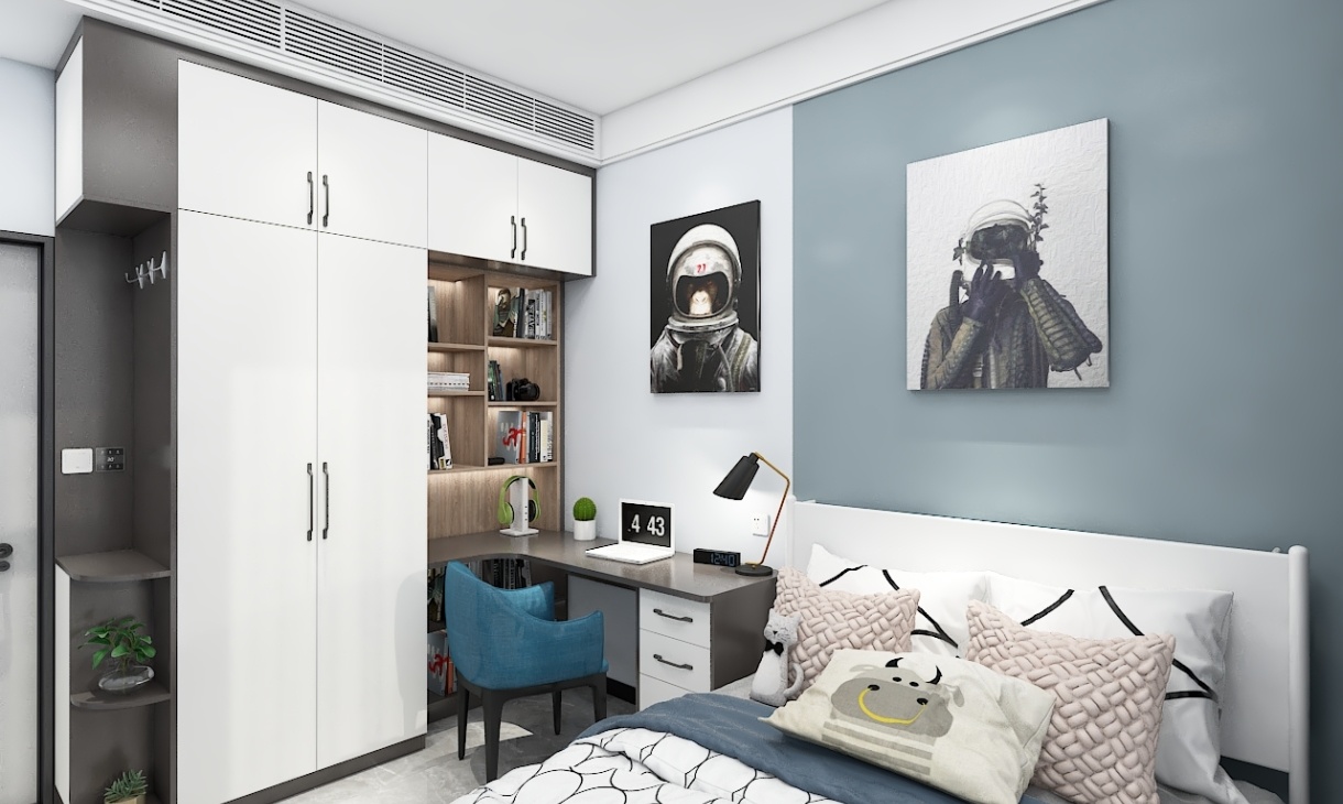 男孩房臥室用藍灰色調,整體衣柜一體化設計,衣柜連帶書柜書桌床頭柜節省空間。