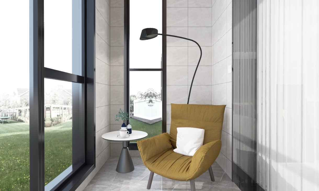 打通陽臺,增加客廳的使用面積,也保證了足夠的采光,分生活區與休閑區兩部分。