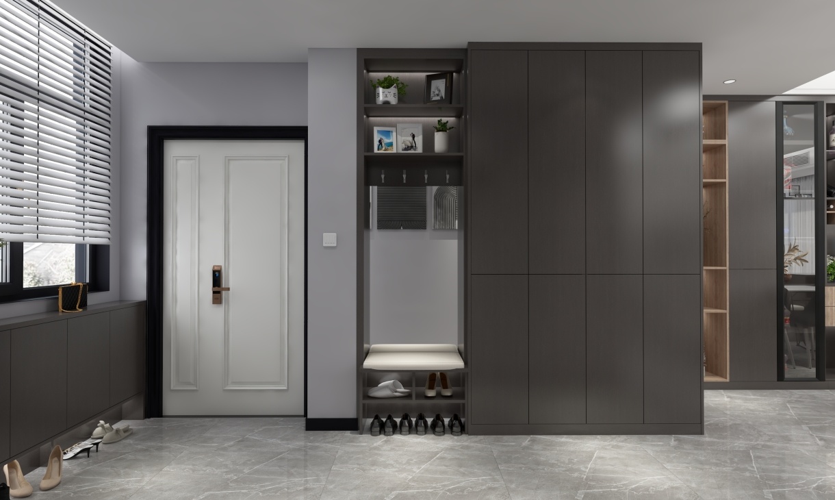 入門兩邊都設計有玄關鞋柜,采用灰色柜門無拉手設計,中間留空裝試衣鏡,干凈利落又不失家的溫馨感。