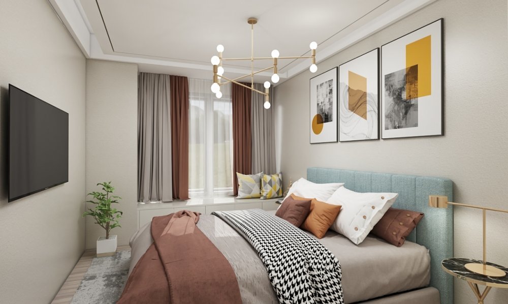 飄窗提升了臥室的格調,藍色床頭與磚紅色床飾的碰撞時尚大氣,裝飾畫與吊頂更好的體現出現代輕奢感。