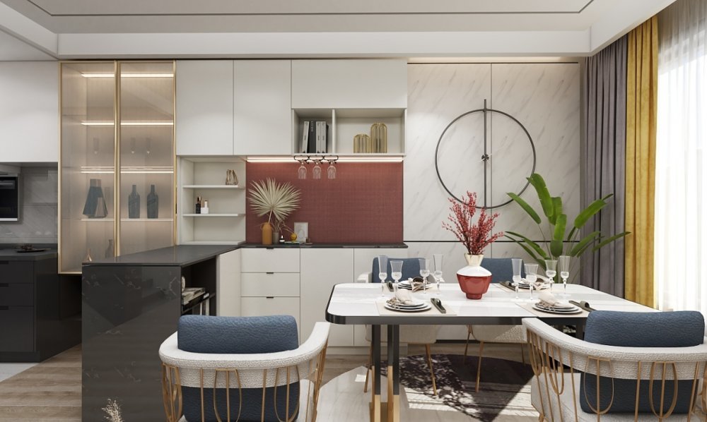 餐廳的設計與廚房相連,吧臺式銜接隔開兩大空間又實用,旁邊設計酒柜更便于享受生活。