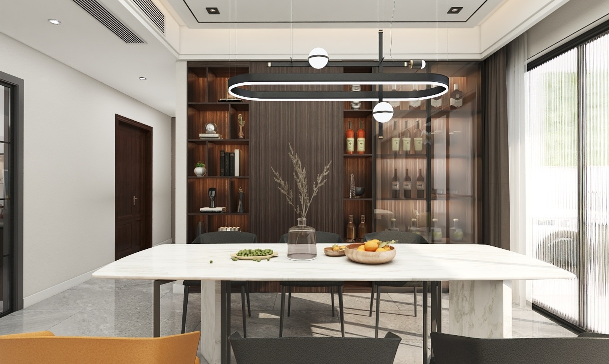 餐廳餐邊柜的設計酒柜與隱形門的結合,虛實交融,為空間增加一絲神秘感。
