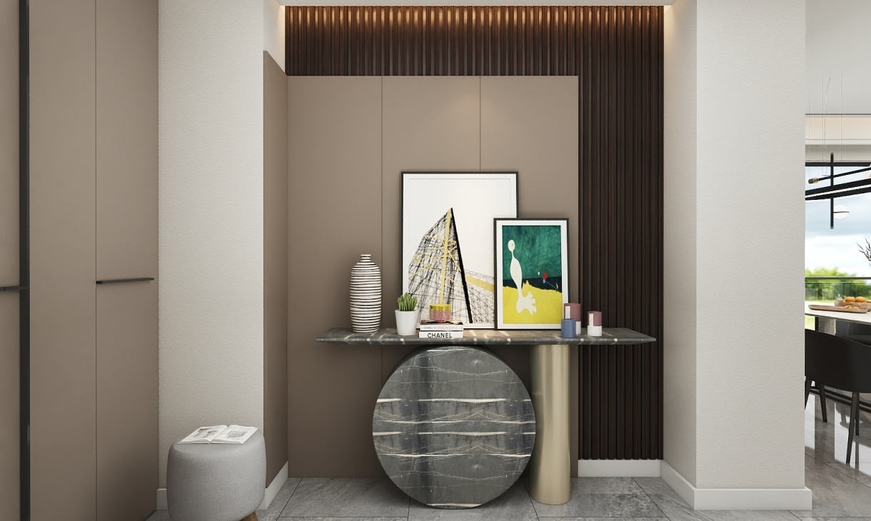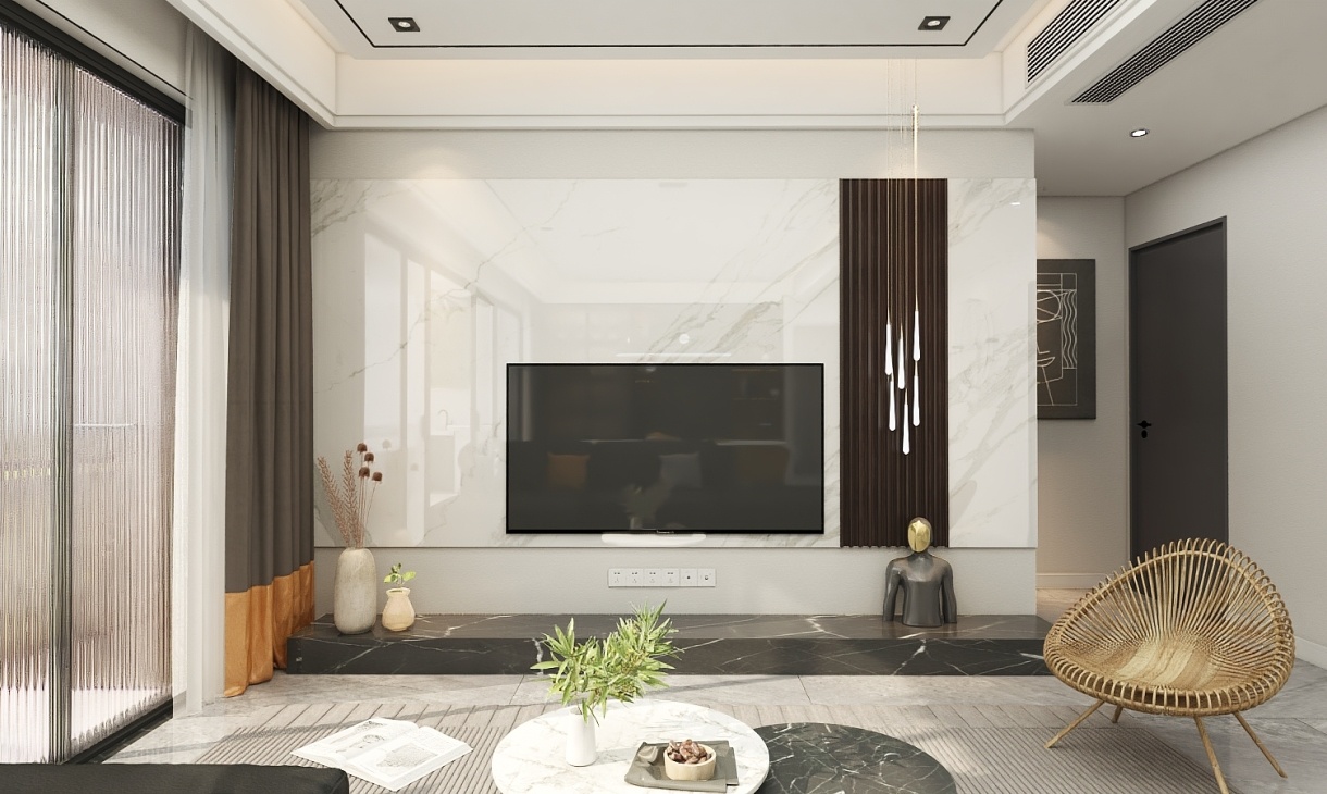 電視墻采用瓷磚與木格柵的拼接設計,呼應玄關區的細節之處。巧妙的拼接設計簡潔時尚又不失質感。