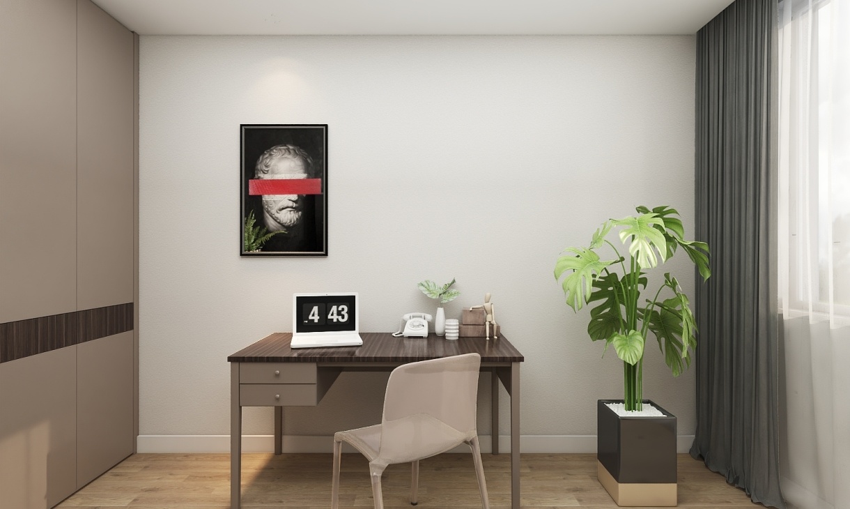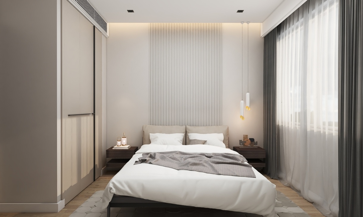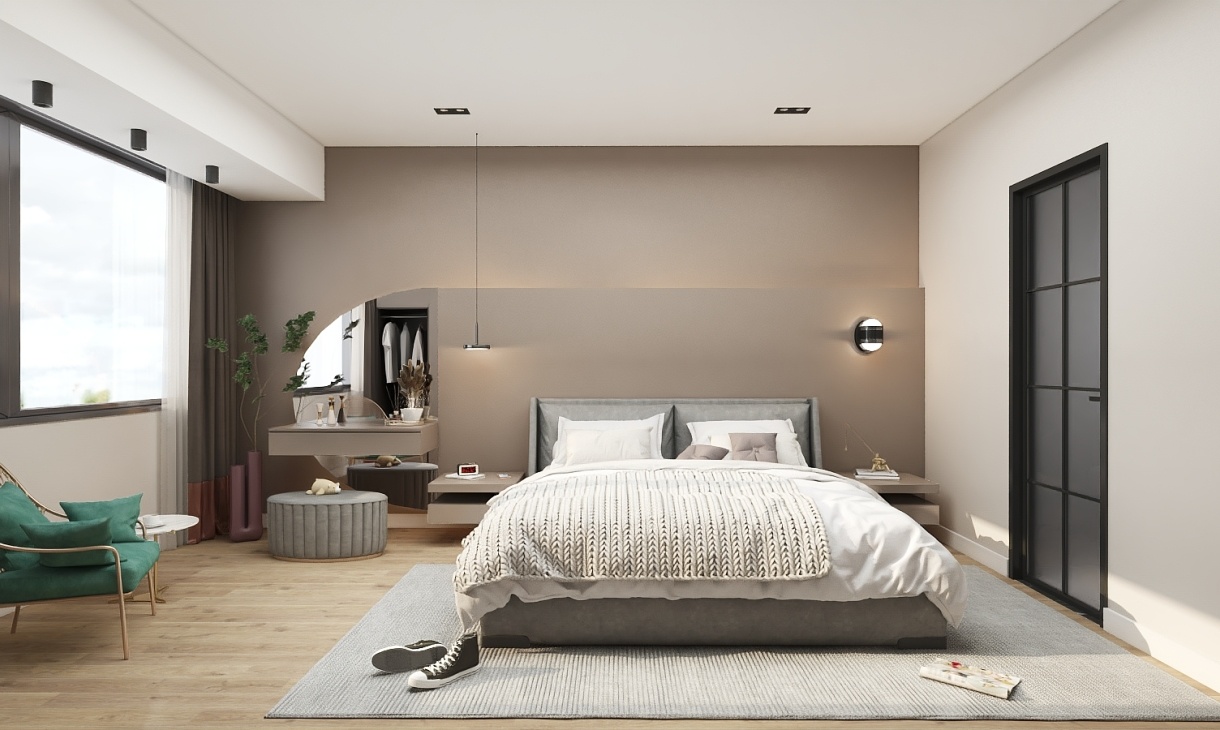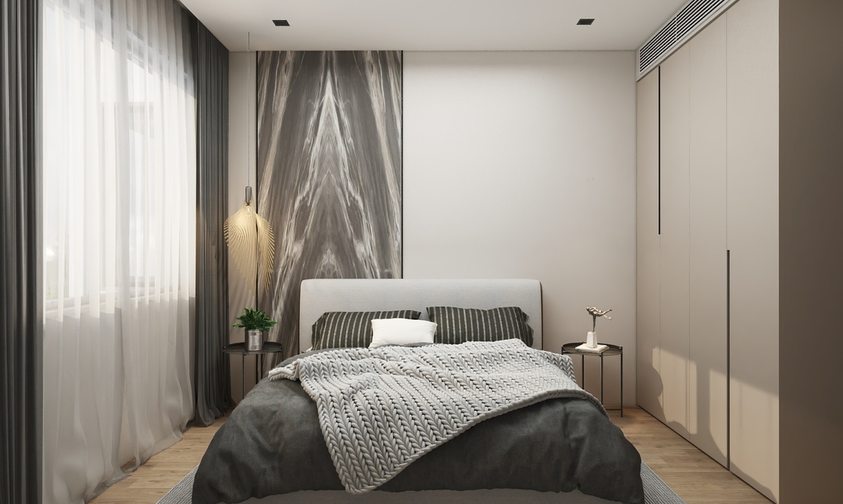 客臥延續整體的配色,床頭做一個石紋板的造型,簡約又不失意境。