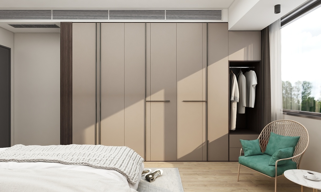 床頭采用的格柵造型,營造線條感和衣柜拉手相互呼應。