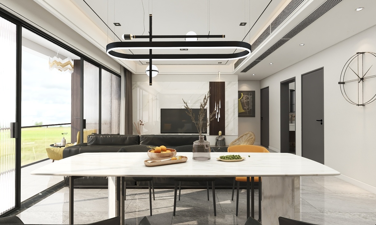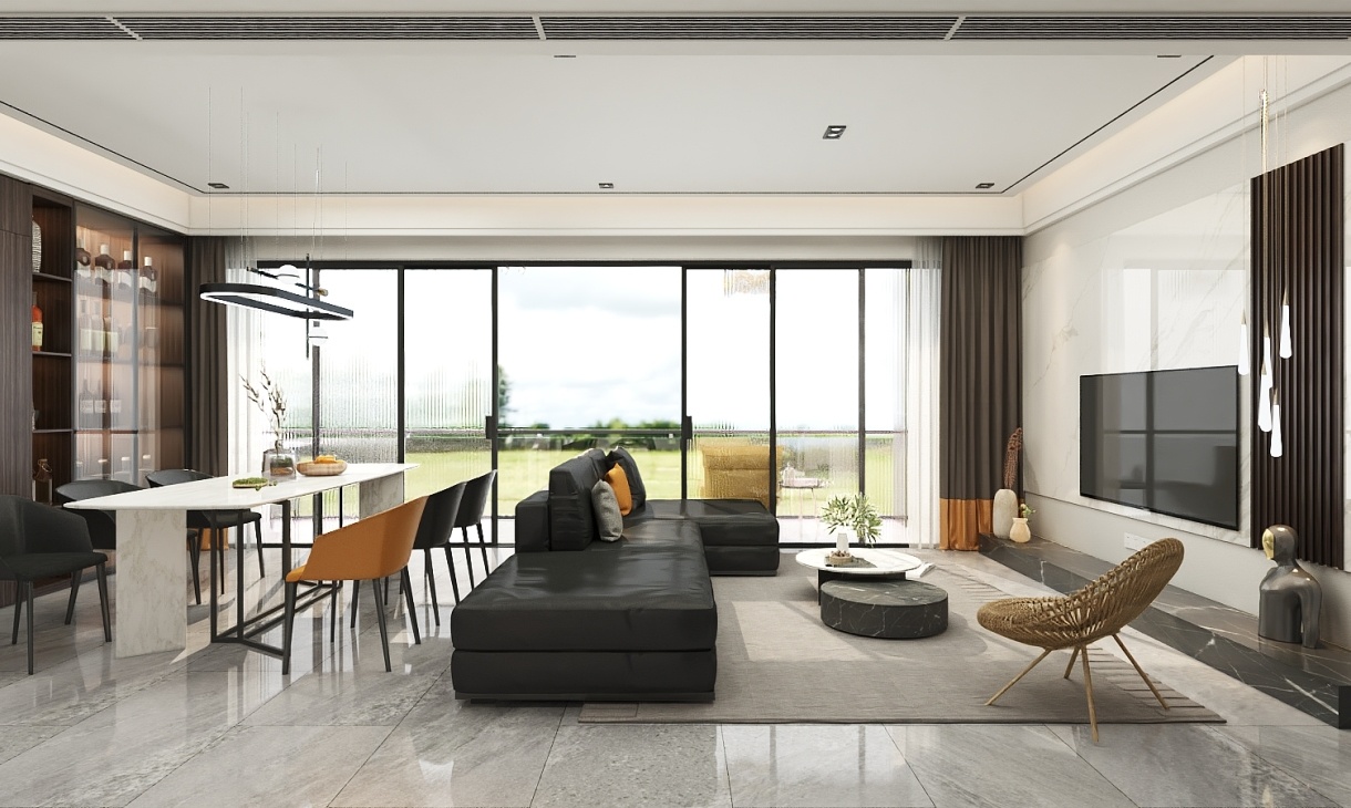 客餐廳一體化設計,與陽臺互通,透明推拉門設計增加空間通透感,客廳瞬間擴大兩倍。