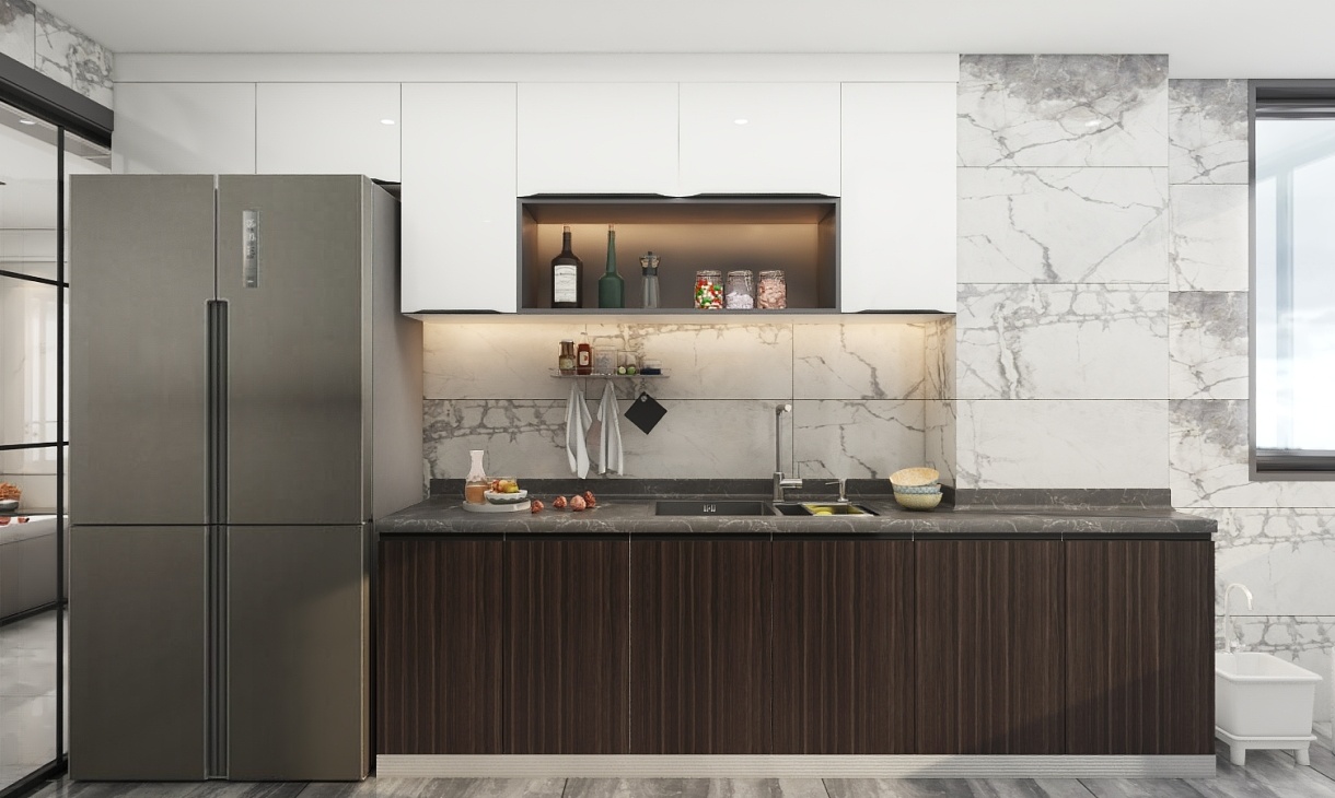 簡約干凈的廚房,吊柜中間區域設計開放區隨手拿取物品,便捷生活,隱形燈帶隱藏其中,充滿設計感,增加時尚氣息。