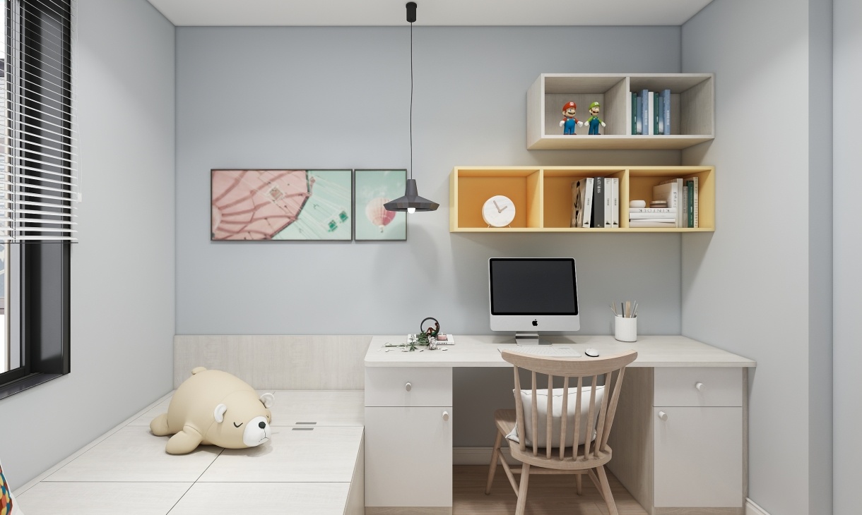 書房或者兒童房都可以設計榻榻米。收納力強所用空間少,一側設計書桌組合辦公、學習兩不誤。