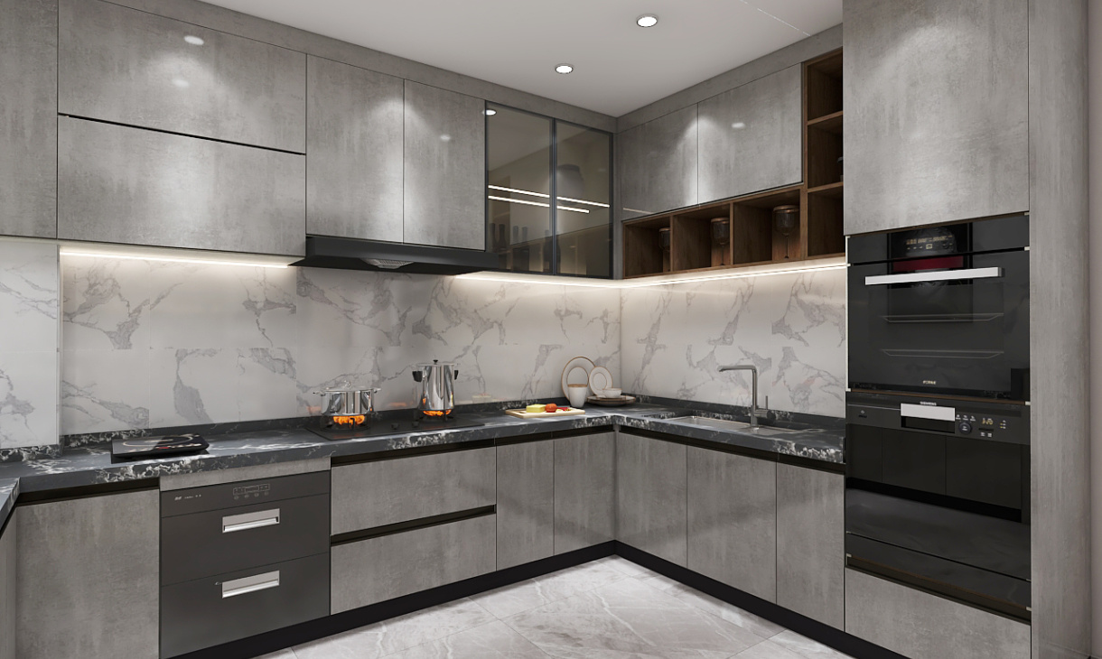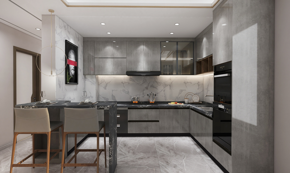 灰色整體櫥柜搭配黑色石英石臺面低調有內涵,正是現代讓追求的家居空間。