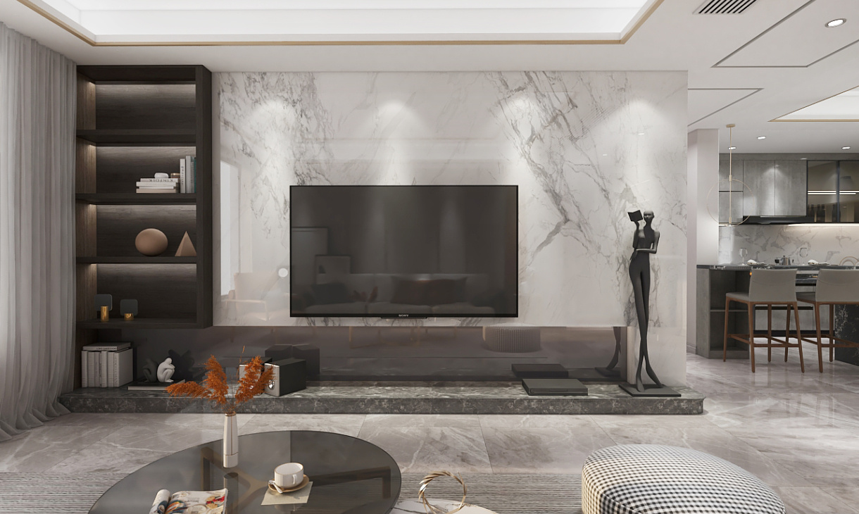 電視背景墻以大理石為裝飾盡顯格調,黑色開放格收納柜裝飾收納兩不誤。