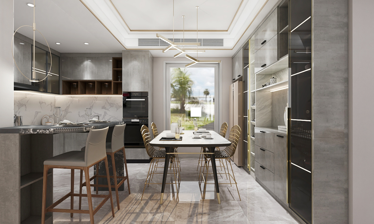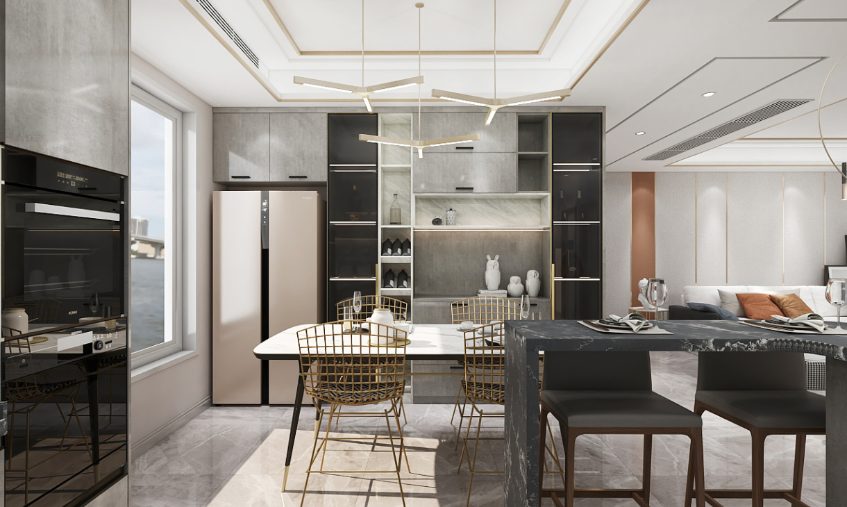 開放式廚房與餐廳相連實用又美觀,整墻的餐邊柜整潔大氣,高級灰搭配黑色將現代與輕奢完美融合。