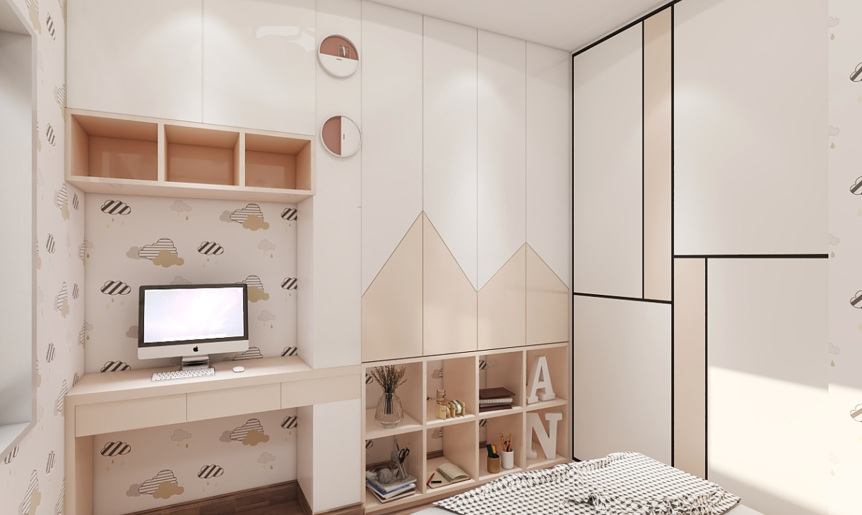 兒童房的設計營造出舒適又充滿童趣的氛圍,拼接色的衣柜和書桌組合美觀又實用,給孩子一個美好童年。