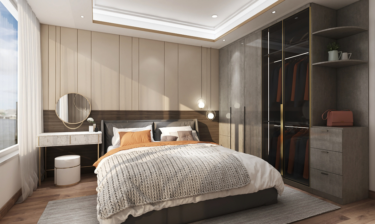 次臥靠近窗戶設計梳妝臺,將輕奢的精致展現的淋漓盡致,白色的到頂衣柜時尚整潔。