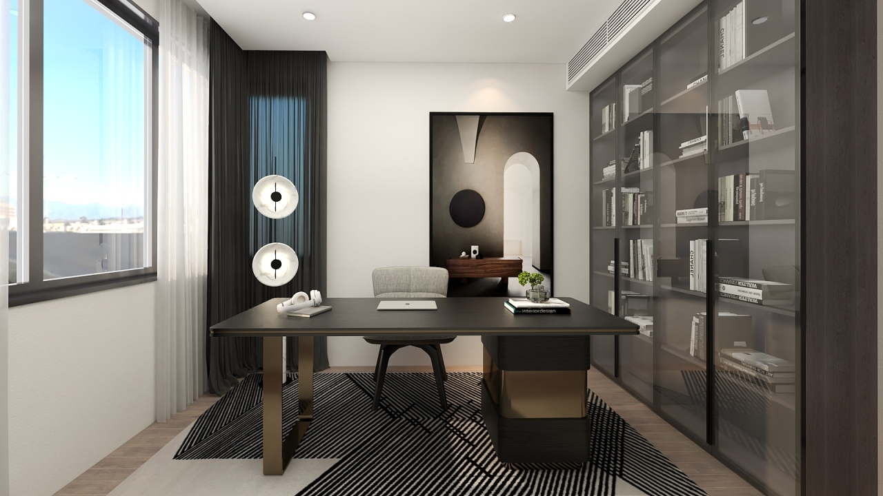 書房設計整體的現代感比較沉穩,色調以黑白為主,沉穩大氣。比較跳躍的彩色現代風格畫作,搭配后現代的書桌和椅子,與其它空間風格形成反差感。