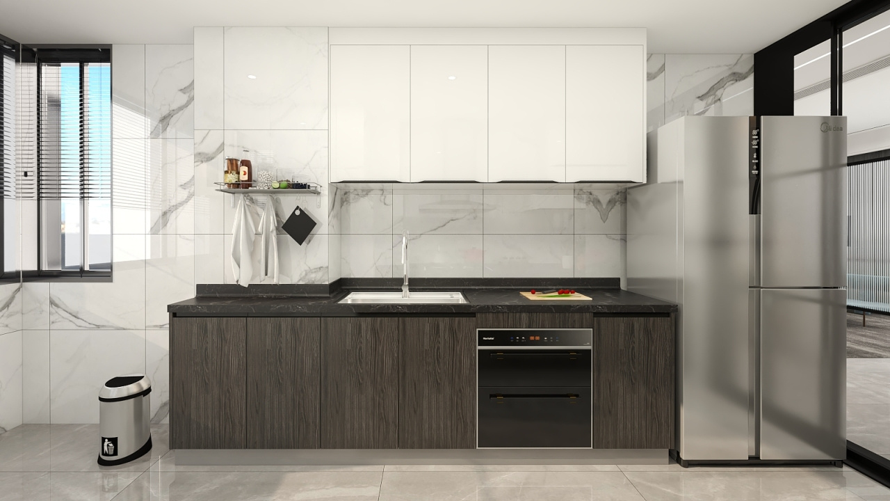 一字型整體櫥柜流暢的線條,現代質感的板材,超EO環保板,環保更安心,標配原裝進口百隆鉸鏈,耐用更長久。