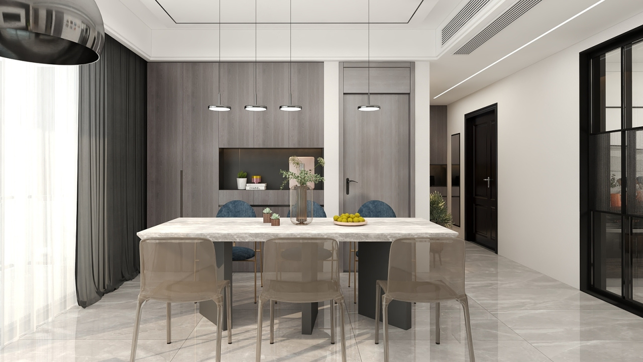 餐廳設計以簡潔為主,灰色的餐桌餐椅,帶來規整的空間層次感。金屬吊燈為餐廳增添品質與高級。