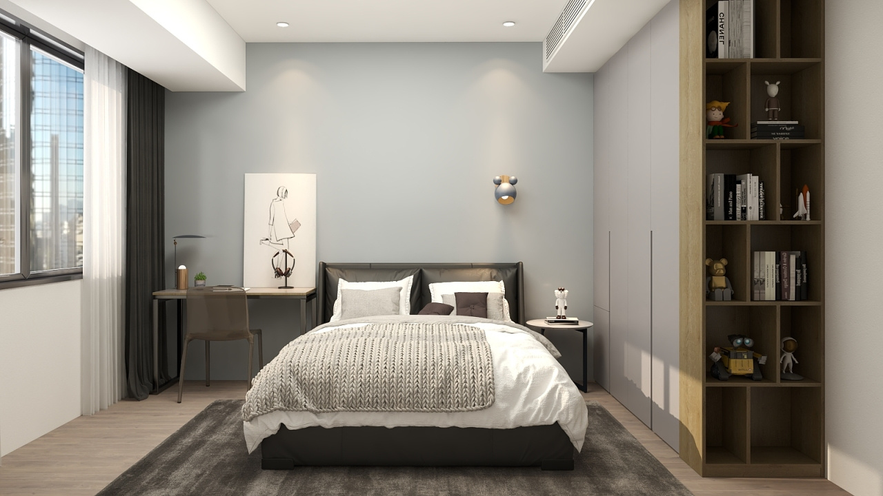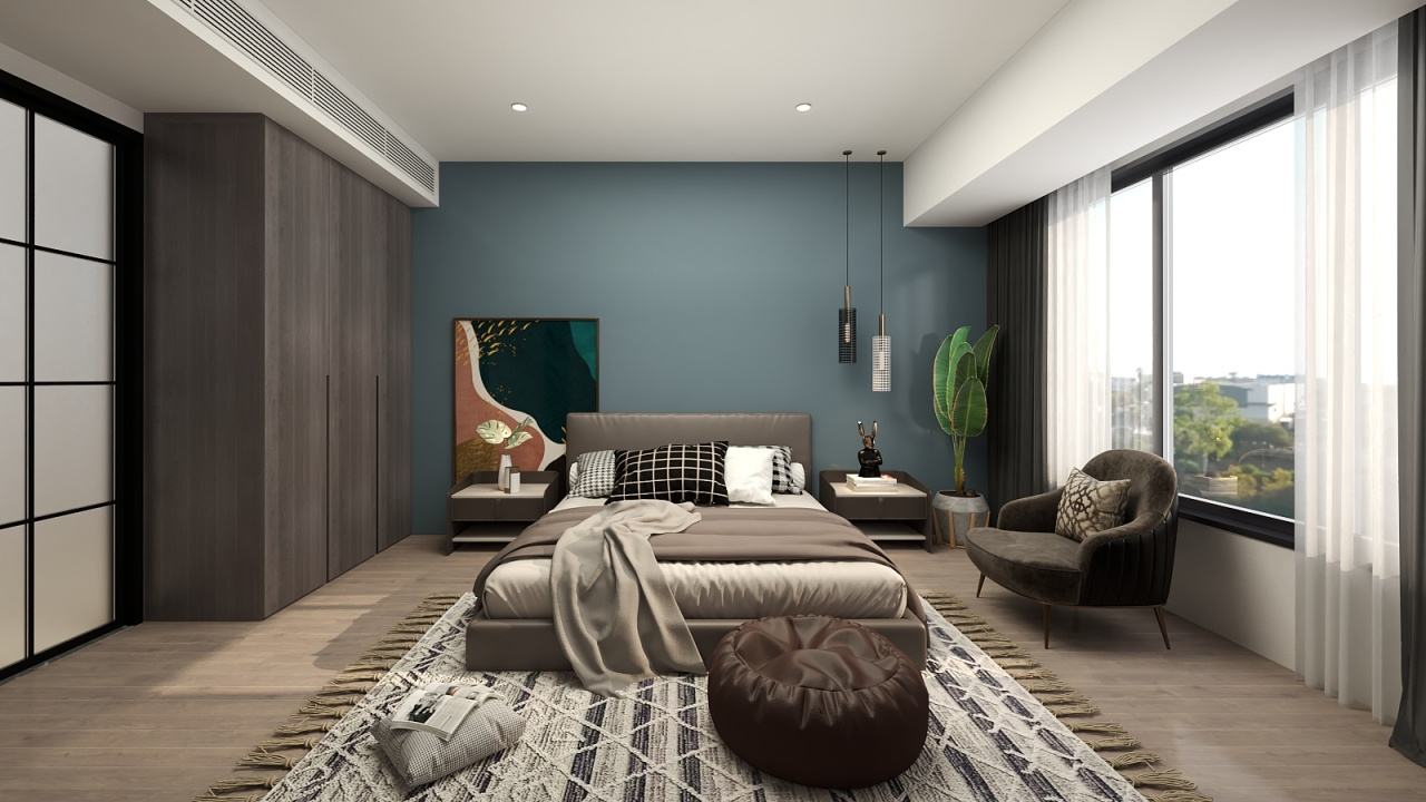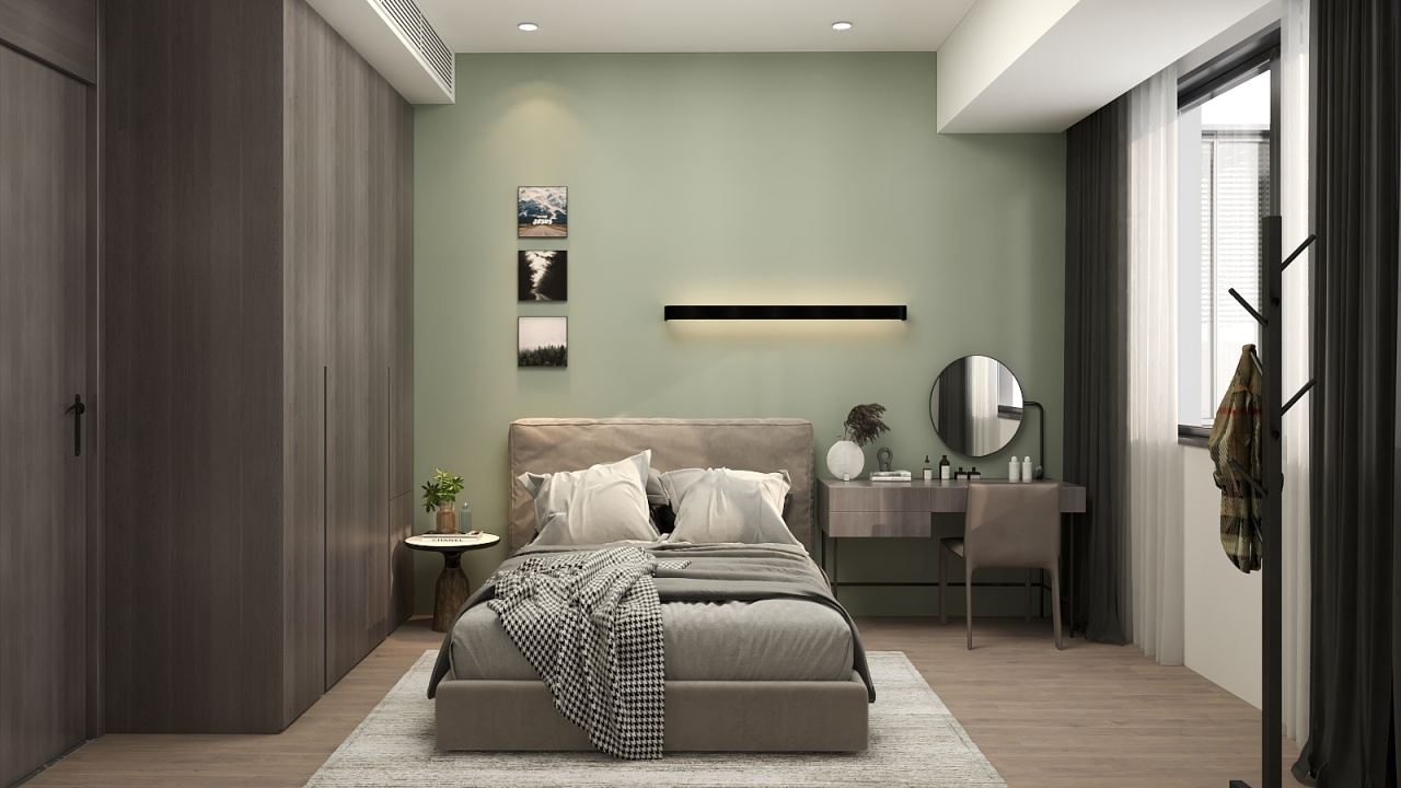 現代風格的臥室搭配,簡約又大氣,干凈素雅的風格很受當代年輕人的歡迎。將莫蘭迪的色調融入整個空間主題色,整體有種清幽的感覺,展現出和諧自然的輕快氛圍。