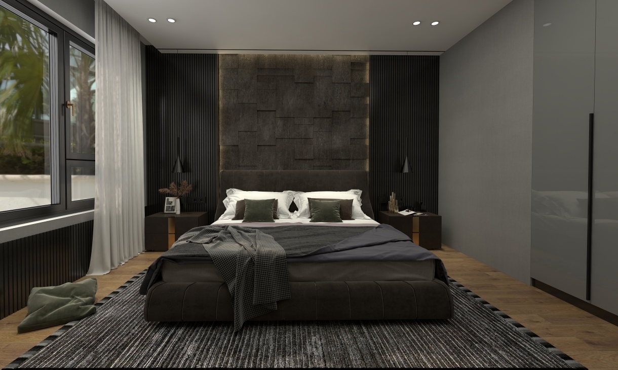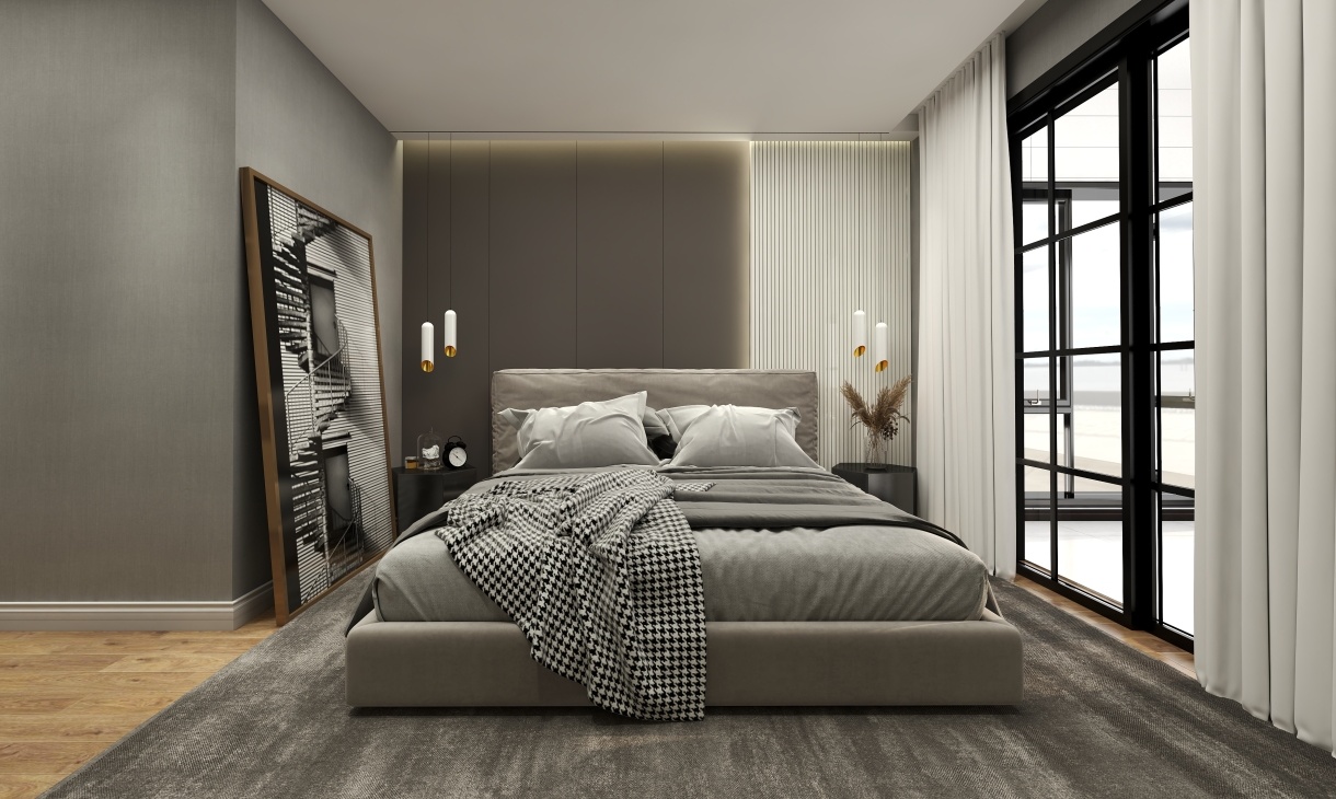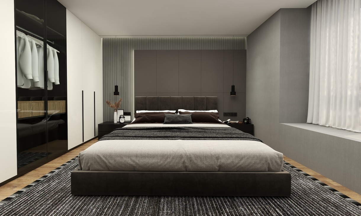灰黑的現代臥室,用輕奢格調輕松打造!臥室空間不大,嵌入式衣柜設計,無形之中擴大室內面積,賦予舒適而沉穩的空間質感。